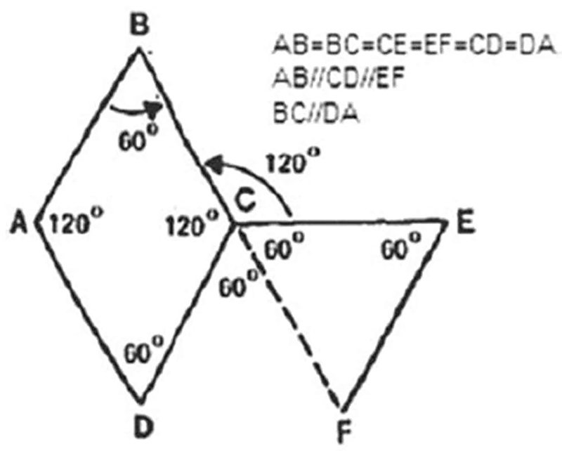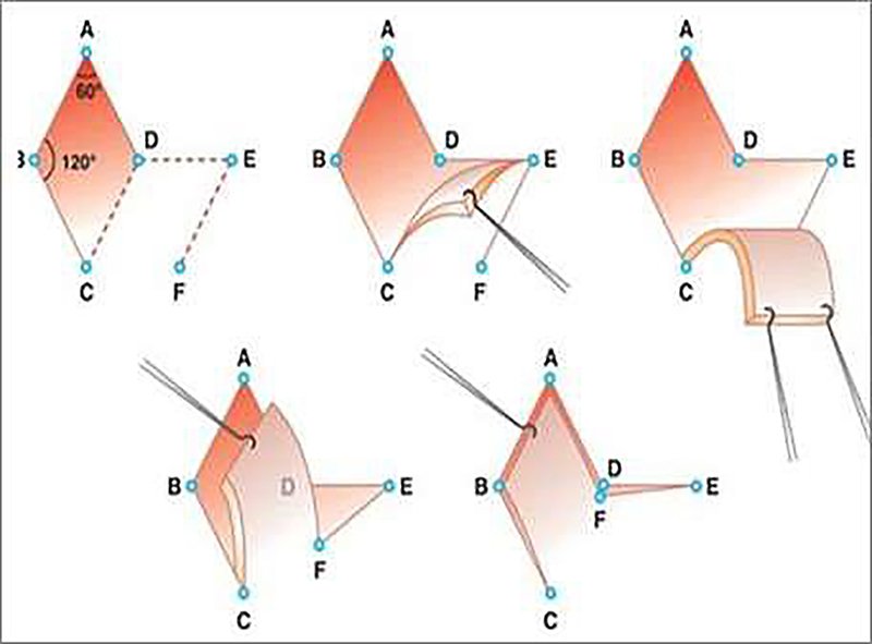 La transposición del colgajo se realiza rotando el mismo a modo que coincidan el ángulo B del defecto con el vértice D del colgajo, el ángulo A del rombo con el vértice E del colgajo y el cierre directo de los ángulos D y F (graf. 3).