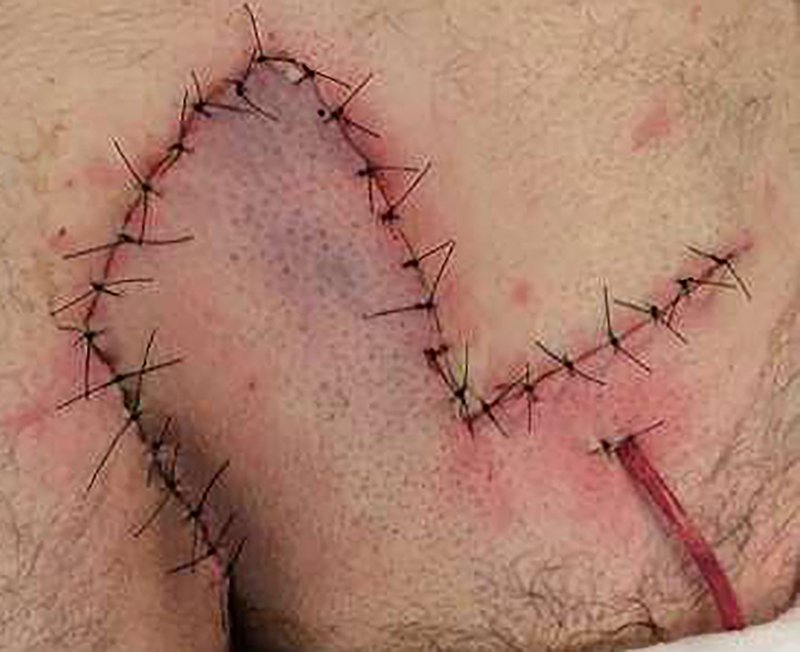 La fijación del colgajo se realiza con material de sutura reabsorbible comenzando desde el plano profundo y realizándose un numero de planos acorde al grosor del colchón dérmico, disminuyéndose lo más posible el espacio muerto. Por último, se cierra piel una vez afrontados los bordes y se coloca un drenaje por contrabertura.