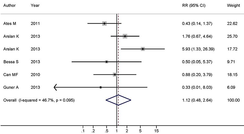 Figura 4: Forest plot del riesgo relativo (RR) de la recurrencia de la enfermedad pilonidal comparando técnica de colgajo de Karydakis vs colgajo de Limberg.