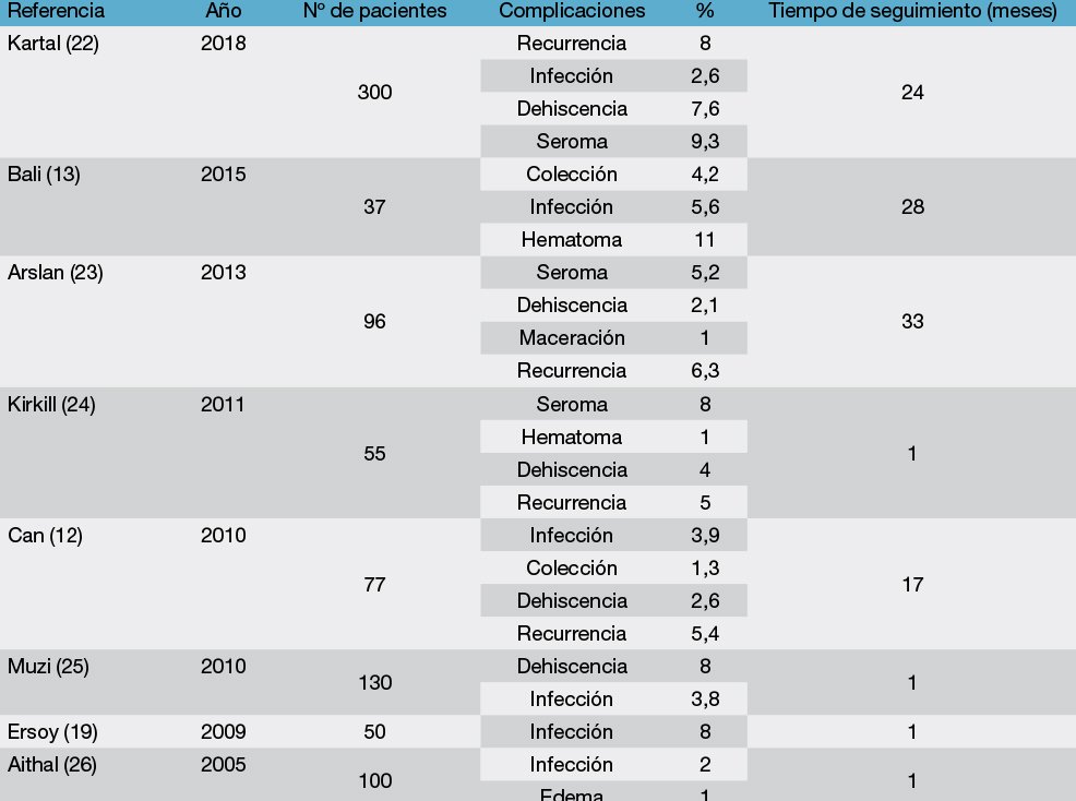 Topgul y col. en un estudio de 200 pacientes, observaron que 3% presentó mínima necrosis del colgajo, seroma en 2%, infección de la herida en 1,5% y recurrencia en 0,5%, después de un seguimiento de cinco años.20 El metaanálisis realizado por Horwood y col. informaron recurrencia en 0,79%, dehiscencia de la herida 0,9%, e infección de la herida en 4,5%.7 Según el estudio de Bali y col. las tasas de desarrollo de colecciones, infección de la herida, edema del colgajo, hematoma y separación parcial de la herida fueron 9,8%, 16%, 7%, 15% y 4,2%, respectivamente; no encontraron necrosis total del colgajo en ningún paciente.13 En la Tabla 1 se presentan algunos resultados reportados en la bibliografía.