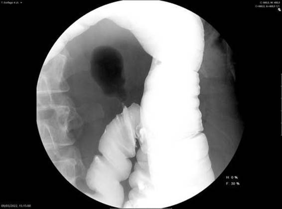 mostró una imagen de gas intraabdominal, similar a un globo. Se realizó una tomografía computada abdominal que informa la presencia de una “gran burbuja” aérea