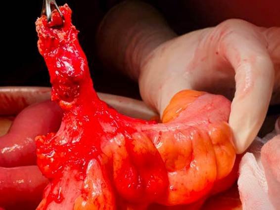 Figura 3. Imagen intraoperatoria. Se aprecia el diverículo gigante y solitario en el colon sigmoides.