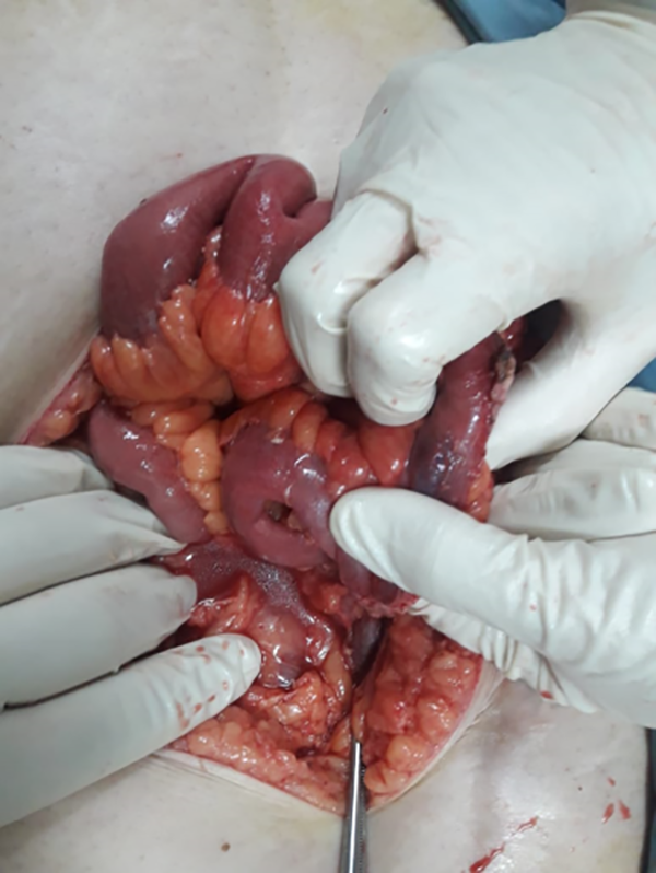 Ingresa por guardia una paciente femenina 71 años de edad, con antecedentes de dolor abdominal y cambios en el ritmo evacuatorio, con heces acintadas, de tres meses de evolución, anexohisterectomía (no recuerda la causa), cirugía bariátrica y colecistectomía. Presenta dolor abdominal de tipo cólico difuso de cinco días de evolución asociado a distensión abdominal, náuseas y falta de eliminación de gases. Nunca se había realizado una videocolonoscopía. Ingresa con signos vitales normales. Presenta el abdomen distendido, globoso, con dolor difuso a predominio fosa iliaca izquierda con defensa parietal, timpánico generalizado y ruidos hidroaéreos disminuidos en intensidad. En el tacto rectal no se hallan lesiones ni evidencia de sangrado. Los estudios complementarios revelan niveles hidroaéreos colónicos sin aire hacia distal (Figura 1). Se colocan una vía periférica, una sonda nasogástrica y una vesical. Dada la evolución clínica y la no respuesta al tratamiento médico junto con los hallazgos imagenológicos se decide realizar una laparotomía de urgencia. Durante el procedimiento quirúrgico se evidencia una lesión de aspecto inflamatorio en rectosigma que involucra al intestino delgado (Figura 2). Se realiza una cirugía de Hartmann. La paciente presenta hundimiento de colostomía y se realiza reconfección de la misma a las 48 horas. El estudio anatomopatológico informa que la pared colónica presenta focos de endometriosis y adherencia a parénquima ovárico y tubárico; diverticulosis; y parénquima ovárico con cuerpo albicans, sin evidencia de lesión neoplásica colónica. Durante su internación intercurre con neumonía intrahospitalaria y fallece durante la internación.