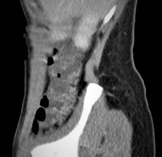 Figura 2. Angiotomografía computarizada. A. Corte coronal. Várices colónicas y engrosamiento y dilatación de ramas de las venas mesentérica superior e inferior. B. Corte sagital. Varices colónicas.