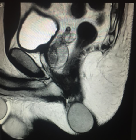 Paciente masculino de 45 años de edad que presenta tumoración perianal de 3 años de evolución. Dicha tumoración ha aumentado su tamaño en este periodo de tiempo y presenta incomodidad durante la higiene y prurito. No existe historia de cirugía o trauma del periné. Sus antecedentes personales revelan solo hipotiroidismo. El examen físico muestra una lesión situada en cuadrante anterolateral izquierdo, duroelástica, bordes netos, móvil, no adherida a planos profundos, no dolorosa a la palpación sin signos de complicación aguda (Figura 1). Estudio por imágenes, RMN: imagen nodular, redondeada, de bordes netos, señal homogénea, hiperintensa en T2 e intermedia en T1. Discretamente hiperintenso en difusión sin restricción significativa de ADC (Figura 2). Toma sutil contacto con MA del lado izquierdo, no involucra a los restantes componentes del canal anal. Mide 35 x 40 mm en plano axial y extensión cefalocaudal de 50 mm. Procedimiento quirúrgico: anestesia raquídea, posición de litotomía, anoscopia sin evidencia de afectación del canal anal, incisión losangica sobre lesión, disección hasta pared del quiste y ectomía del mismo. Cierre del lecho quirúrgico con técnica semicerrada. Alta sanatorial a las 24 h. Controles posquirúrgicos sin evidencia de recidiva.