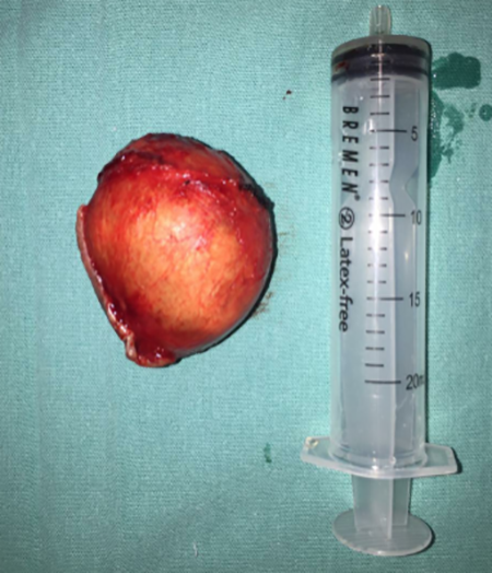 Informe Anatomopatológico: formación quística que mide 4,5 x 1,5 cm, compatible con quiste epidermoide (Figura 3).