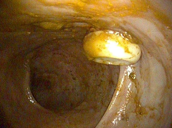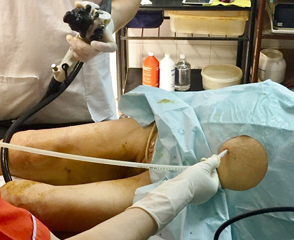 Como primer paso se realiza una colonoscopía para determinar por transiluminación el sitio de colocación de uno o más tubos. Generalmente, se elige la parte media del colon sigmoides, aunque supeditado a la afección que se pretende resolver y las características del paciente (Fig. 3).